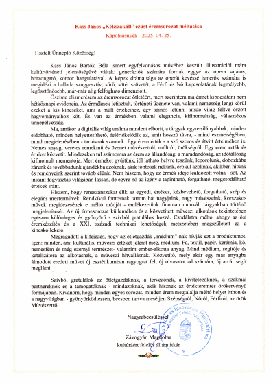 Závogyán Magdolna kultúráért felelős államtitkár ezekkel a megtisztelő szavakkal illette a Kass János – “Kékszakáll” éremsorozatunkat.